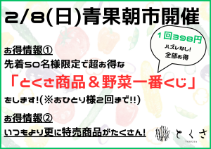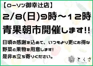 ローソン御幸辻店にて朝市開催! 2026.02.07 明日2月8日(日) ローソン御幸辻店にて朝市を開催いたします!! いつも以上にお得な新鮮野菜を販売(^^♪ そして!なんと!「とくさの商品が当たる⁉一番くじ」をやりますよ♪ ぜひお越しください(^_-)-☆